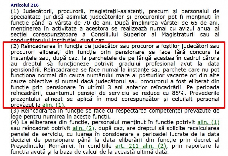 In cazul fostilor judecatori sau procurori, care se reincadreaza fara concurs in functia de judecator sau procuror, raman aplicabile prevederile articolului 216 al. 2 din