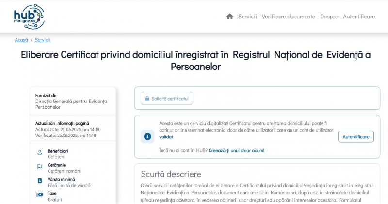 Certificatul electronic de atestare a adresei de domiciliu este emis de Directia Generala pentru Evidenta Persoanelor. Poate fi cerut online sau la ghiseu, este disponibil in format electronic sau pe hartie si are valabilitate limitata. Procedura este relativ rapida, insa ramane inca necesara in multe situatii din cauza tranzitiei incomplete catre sistemele digitale.